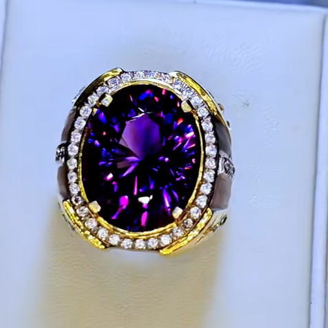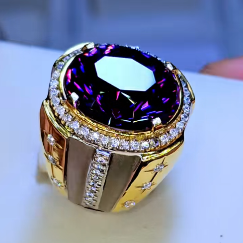 - Viên Đá Chủ: Viên đá trung tâm có màu tím đậm, rực rỡ và sâu thẳm. Với độ trong suốt cao và các tia sáng tán xạ mạnh mẽ, viên đá này nhiều khả năng là Amethyst (Thạch Anh Tím) hoặc Iolite chất lượng cao, có thể đã được cắt mài theo kiểu Diamond Cut hoặc Checkerboard Cut để tối đa hóa độ lấp lánh và chiều sâu màu sắc. Màu tím đậm này đại diện cho sự tâm linh, quý tộc và giàu có.