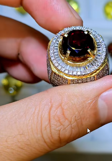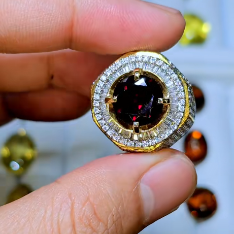- Viên Đá Chủ: Trung tâm chiếc nhẫn là viên đá quý màu Đỏ Đậm (Đỏ huyết/Đỏ tía), rực rỡ và có chiều sâu. Dựa trên màu sắc và ánh lửa, viên đá này có thể là Garnet (Ngọc Hồng Lựu) chất lượng cao hoặc Ruby (Hồng Ngọc). Màu đỏ đậm này tượng trưng cho lửa, sự sống và lòng dũng cảm, là màu sắc của sự giàu có và thịnh vượng.