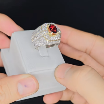 Viên đá chủ trong chiếc nhẫn có màu Đỏ (hoặc Đỏ Tía) rực rỡ và cuốn hút.