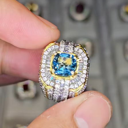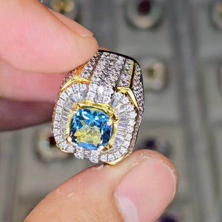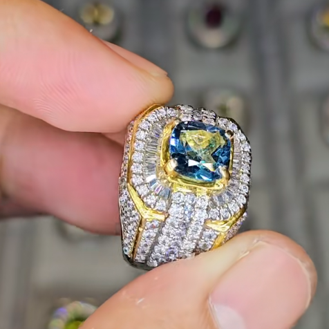 Chiếc nhẫn này có thiết kế tương tự chiếc nhẫn đỏ trước đó, với phong cách bản to, bề thế và vương giả, thể hiện sự quyền lực và vị thế. Tuy nhiên, sự kết hợp giữa viên đá chủ màu xanh dương (xanh da trời/xanh nước biển) và các viên kim cương/đá quý tấm màu trắng tạo nên một tổng thể sang trọng, quý phái nhưng vẫn giữ được nét mạnh mẽ, nam tính (hoặc cá tính). Các viên đá tấm được đính dày đặc xung quanh (kỹ thuật Pave và Baguette) giúp chiếc nhẫn luôn rực rỡ dưới mọi góc độ ánh sáng.