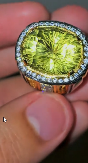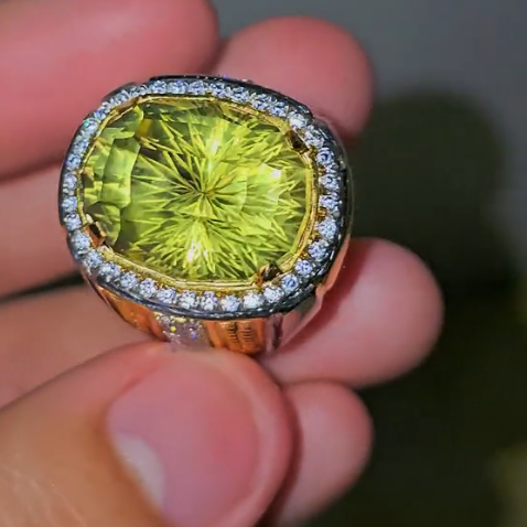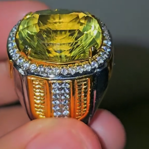 - Viên đá chủ: Màu vàng chanh tươi sáng của viên đá quý này tượng trưng cho ánh sáng mặt trời, niềm vui, sự lạc quan và trí tuệ. Đặc biệt, nếu đây là Thạch anh Vàng (Citrine), nó còn được mệnh danh là “Viên đá của Thương gia” hay “Viên đá Tài Lộc”, có tác dụng thu hút sự giàu có, thịnh vượng và may mắn trong kinh doanh. Hình dáng đá lớn, cắt giác tỉ mỉ (có thể là giác cắt độc đáo như Radiant hoặc Starburst tùy theo góc nhìn của bức ảnh thứ hai) giúp tối đa hóa độ tán sắc và năng lượng của viên đá.