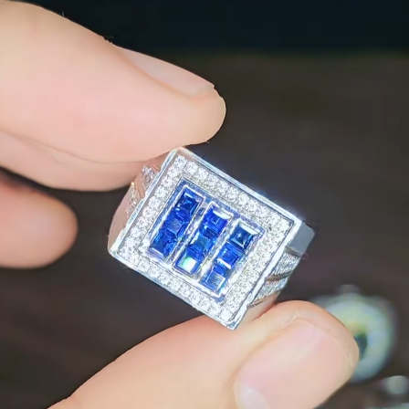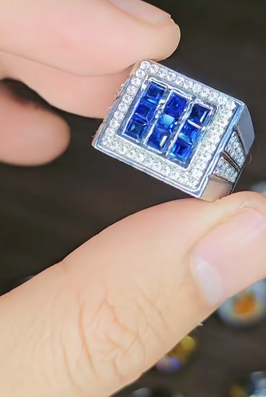 - Viên đá chủ: Màu xanh dương đậm rực rỡ và quý hiếm này rất có thể là Sapphire Xanh (Blue Sapphire) hoặc Topaz Xanh Thụy Sĩ/London chất lượng cao. Các viên đá được cắt giác Princess Cut (vuông sắc nét) và sắp xếp thành bố cục 3×3 hoặc 3×2, tạo nên một mặt nhẫn bề thế, gọn gàng.