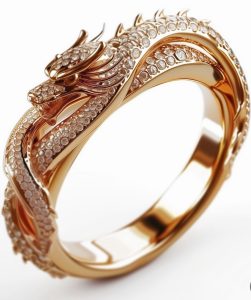 Điểm nổi bật của chiếc nhẫn là đầu rồng được chạm khắc chi tiết, tạo hình rõ nét với sừng, mắt và các đường nét mạnh mẽ. Thân rồng quấn quanh thân nhẫn, tạo thành một vòng khép kín. Phần lớn thân và đầu rồng được khảm những viên đá quý nhỏ lấp lánh, có thể là kim cương tạo nên vẻ sang trọng và thu hút.