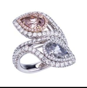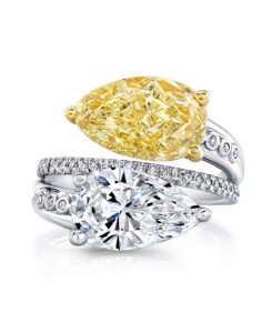 - Đá Chủ: Hai viên đá quý hình Giọt nước (Pear-cut) cỡ lớn, được đặt đối xứng, kề nhau theo hình xoắn ốc trên thân nhẫn: